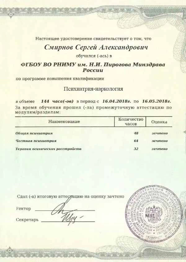 • 2018 г. — Сертификат специалиста: ФГБОУ ВО «РНИМУ имени Н.И. Пирогова» Минздрава России (психиатрия-наркология).